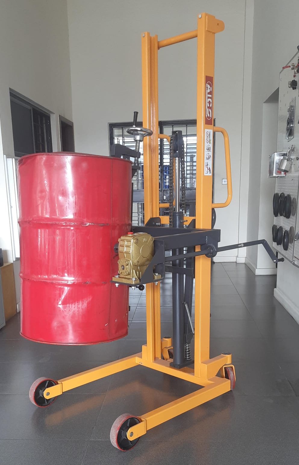 The drum gripping mechanism is designed to securely hold standard drums, preventing accidental slips or spills during lifting and transport. Equipped with high-quality wheels, the stacker offers smooth and stable movement across different floor surfaces, and its compact design allows easy maneuvering in narrow aisles or confined spaces.